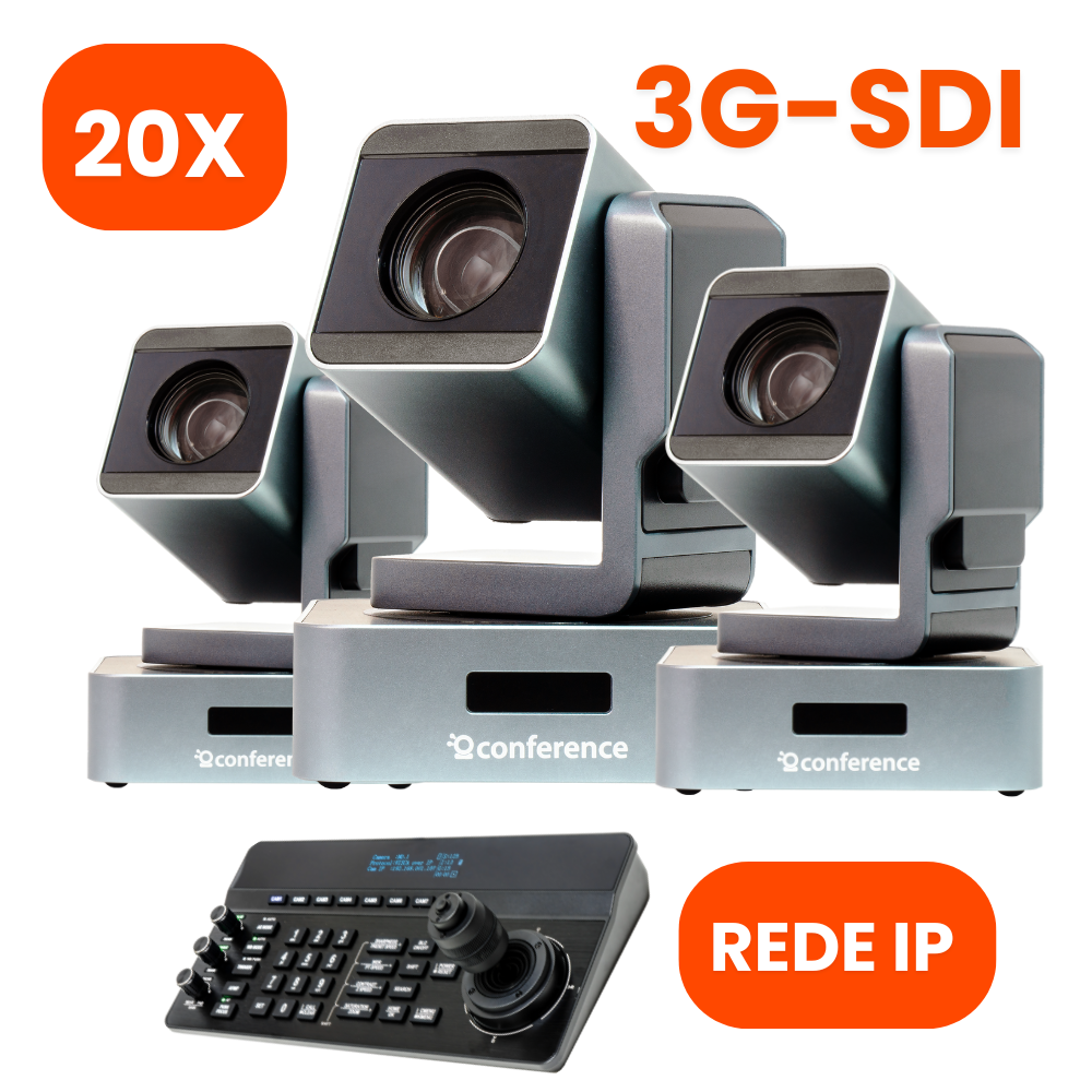 Kit 3 Câmeras Mini PTZ 20X PRO + 1 Joystick IP ConferenceO 'Kit 3 Câmeras Mini PTZ 20X PRO + 1 Joystick IP Conference + 3 Suportes de Parede' oferece uma solução prática para captura de vídeo em alta qualidade, com recursos de controle remoto e montagem conveniente. É indicado para iniciantes em projetos de transmissão ao vivo, podendo ser utilizado em diversas aplicações, como videoconferências, transmissões ao vivo de eventos, cultos, podcasts, entre outros.